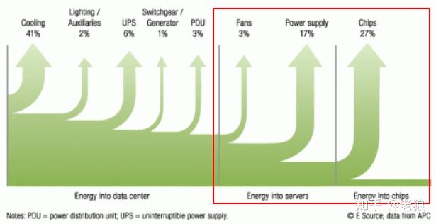 能源消耗大约只有47%的部分进入了服务器(红框部分),这才是有效的能耗。而41%的部分被散热消耗掉了!