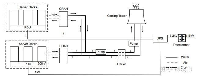 散热部分包括机架风扇,空调、泵机和散热塔。这些部分消耗的能源占据数据中心能源消耗的很大一部分,也在TCO中占据的很大的比重。