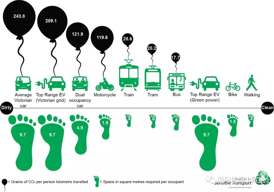 根据澳大利亚Institute for Sensible Transport的根据墨尔本市的实际数据测算研究,各种交通工具的平均碳排放(克/人-公里)和占用面积(平方米/人)如下图所示: