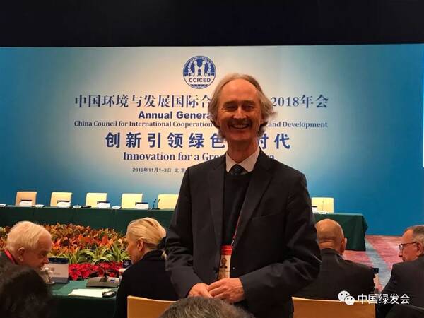挪威驻华大使裴凯儒先生(Geir O. Pedersen)在国合会2018年会上。绿会秘书长周晋峰与裴凯儒亲切交谈后,笔者抓拍到这一张——“裴大使,笑一个!”。据新华网10月1日报道,裴凯儒将成为新任联合国叙利亚问题特使。此前他曾任挪威常驻联合国代表,2005年接替德米斯图拉出任时任联合国秘书长安南派驻黎巴嫩的私人代表。摄/中国绿发会Linda