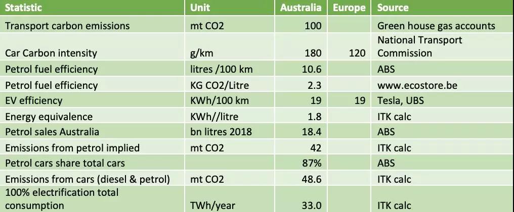 澳大利亚交通领域碳排放、汽车油耗、电动车效率的关键数据