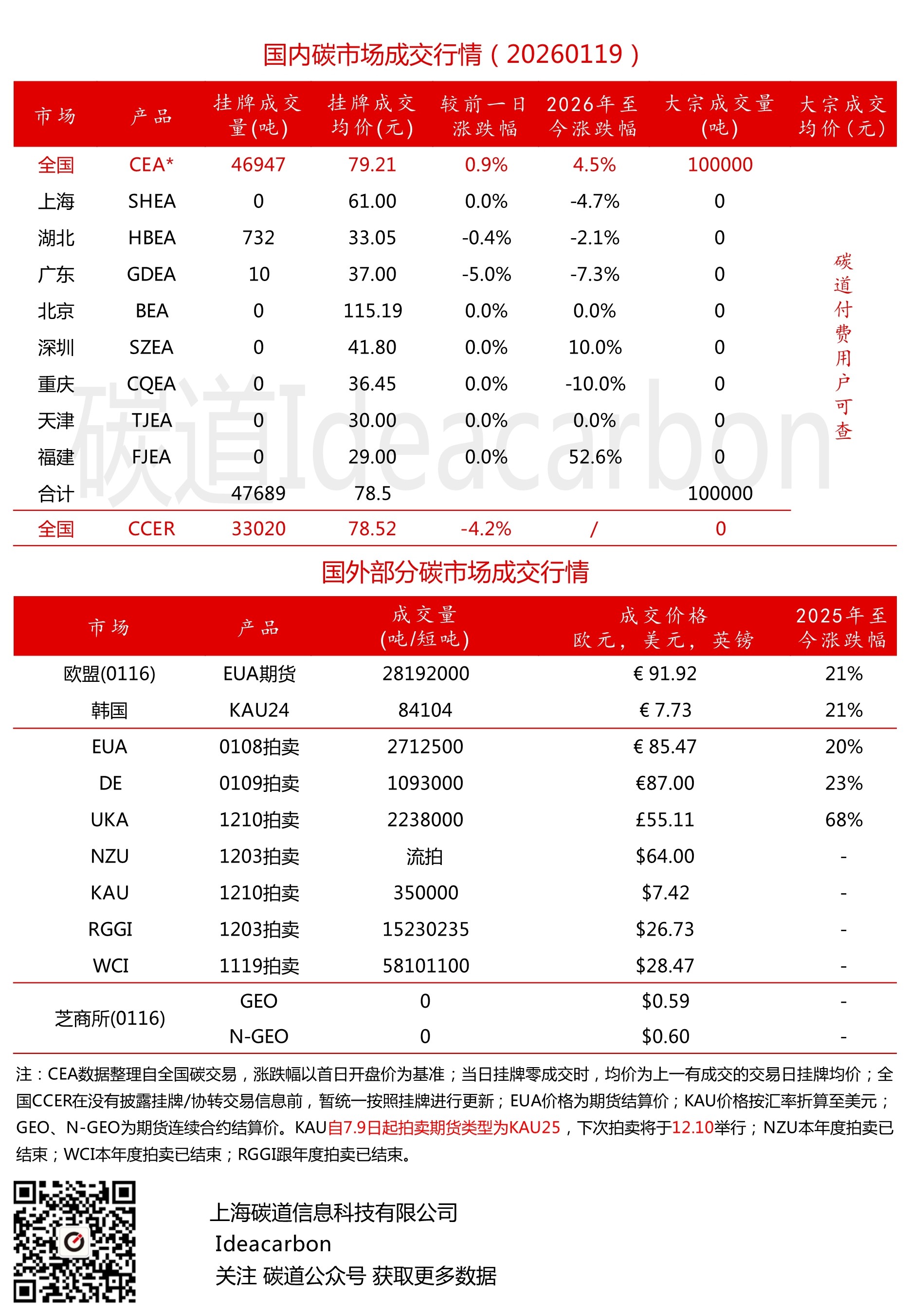 摘要:全国碳配额CEA发生10万吨大宗协议转让,成交均价较市场价低0.27%