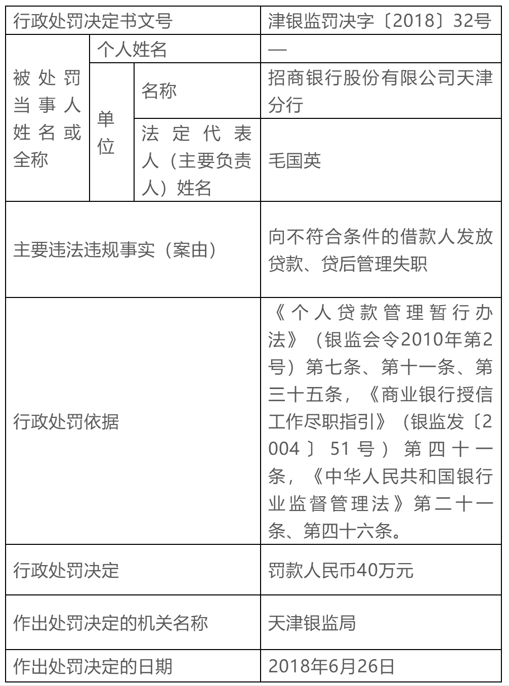 摘要:近日,中国银保监会网站公布了中国银监会天津银监局行政处罚决定书(津银监罚决字〔2018〕31号至35号)。 兴业银行股份有限公司天津华苑支行、招商银行股份有限公司天津分行、广发银行股份有限公司天津分行、平安银行股份有限公司等4家银行被罚款340万元。