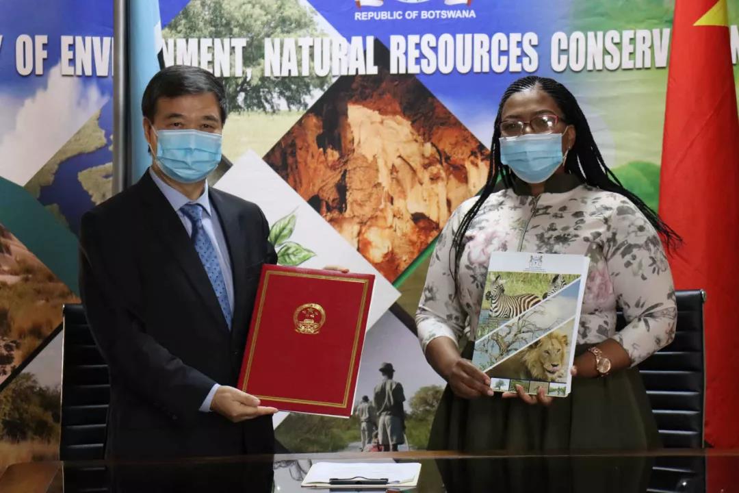 11月9日,《中华人民共和国生态环境部与博茨瓦纳环境、自然资源保护与旅游部关于应对气候变化南南合作物资赠送的谅解备忘录》签约仪式在博茨瓦纳成功举行。我国驻博茨瓦纳大使赵彦博代表生态环境部与博茨瓦纳环境部部长凯伦出席签约仪式并致辞。