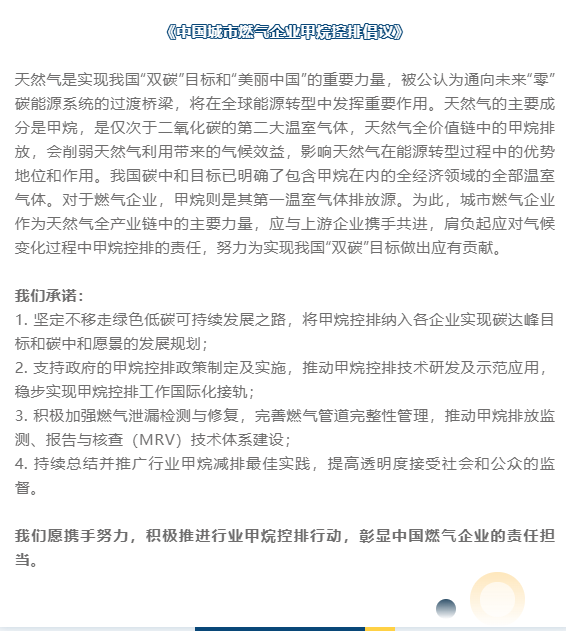 摘要:10月15日,由中国土木工程学会燃气分会、《煤气与热力》杂志社有限公司主办,北京市燃气集团有限责任公司、美国环保协会北京代表处、新奥能源控股有限公司共同举办的“中国燃气运营与安全研讨会(第十一届)暨‘中国土木工程学会燃气分会2021年学术年会’ ”期间,十二家中国城市燃气企业共同签署了《中国城市燃气企业甲烷控排倡议》,标志着中国城市燃气企业在甲烷控排行动方面迈出了重要一步!