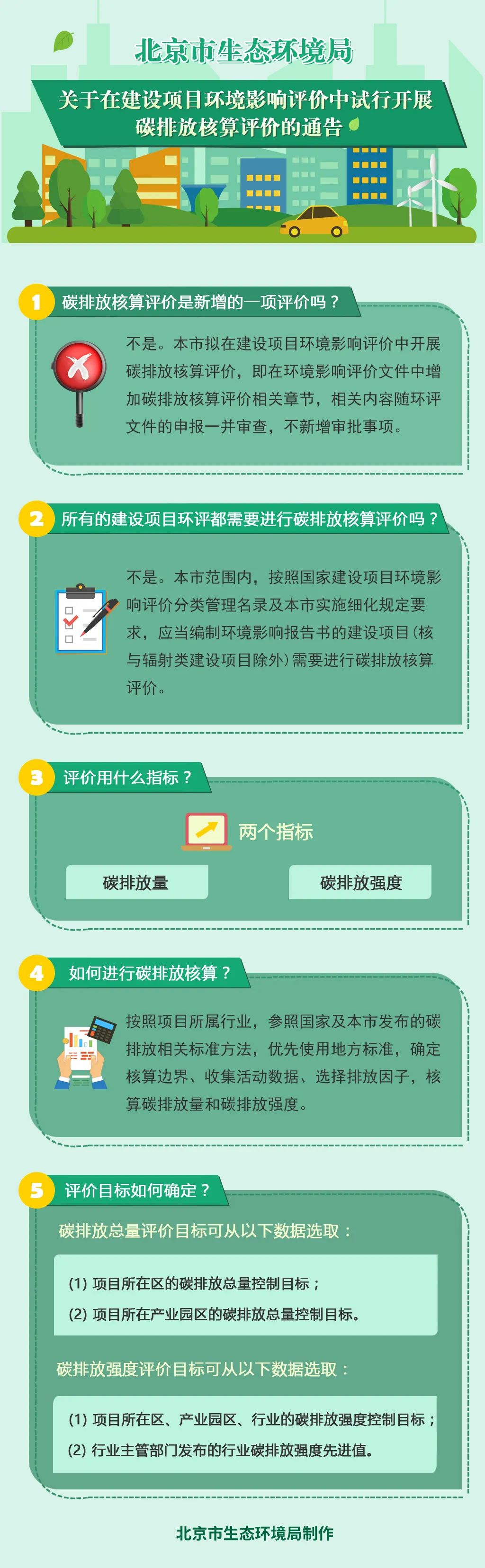 经生态环境部批复同意,北京市生态环境局决定自2023年8月1日起在本市建设项目环境影响评价中试行开展碳排放核算评价相关工作。