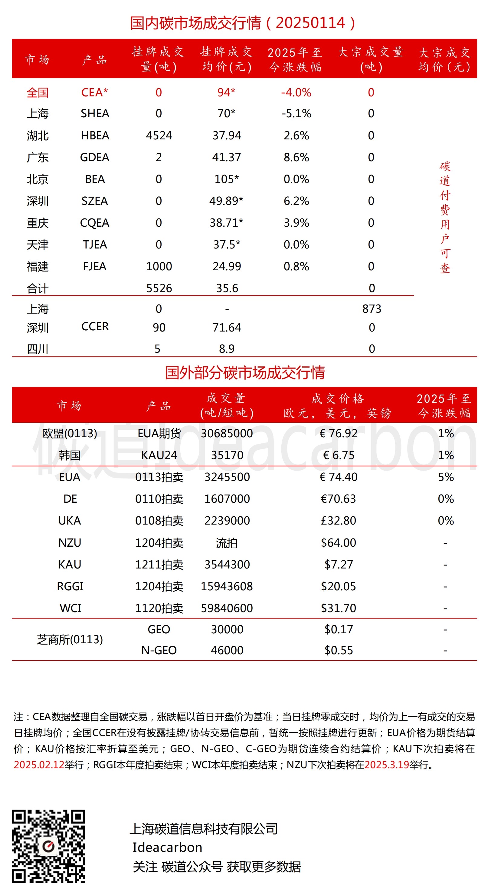 每日碳市场成交行情(20250114)