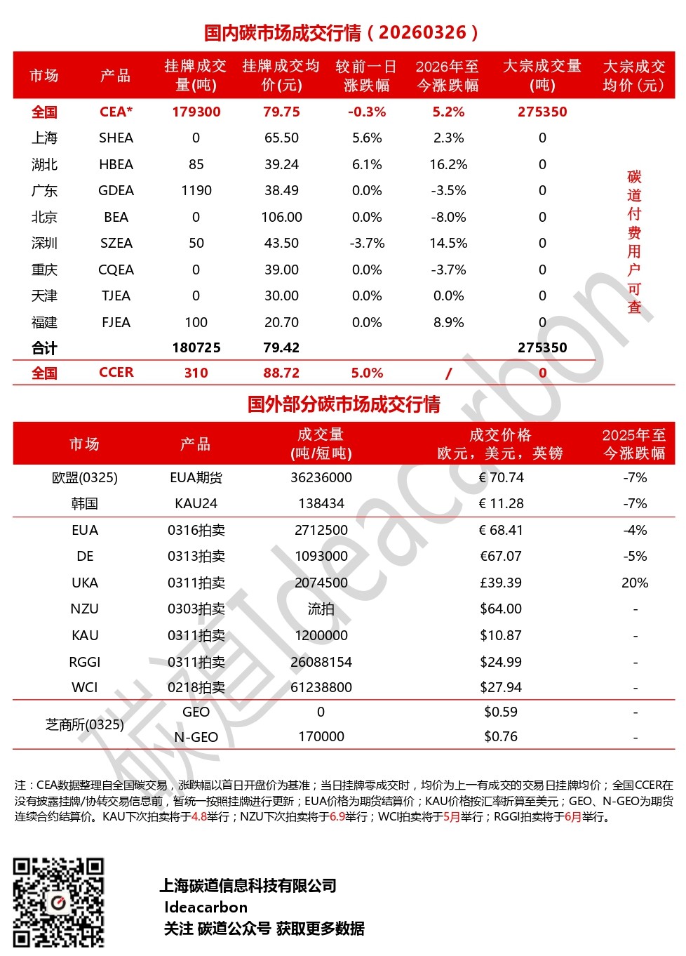 每日碳市场成交行情(20260326)