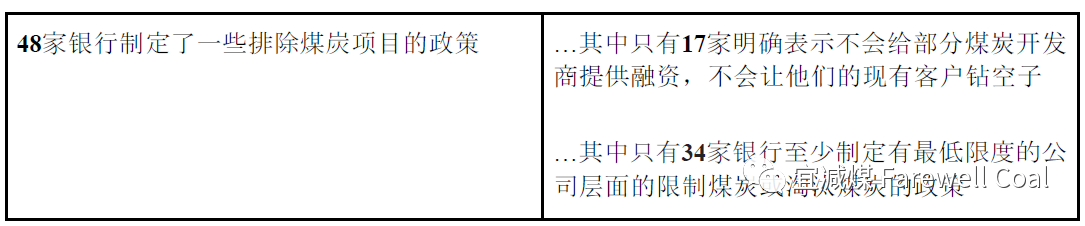 虽然本报告中的大多数银行制定了限制化石能源融资的政策,但大部分仅限制特定项目的融资,或仅限制煤炭融资。