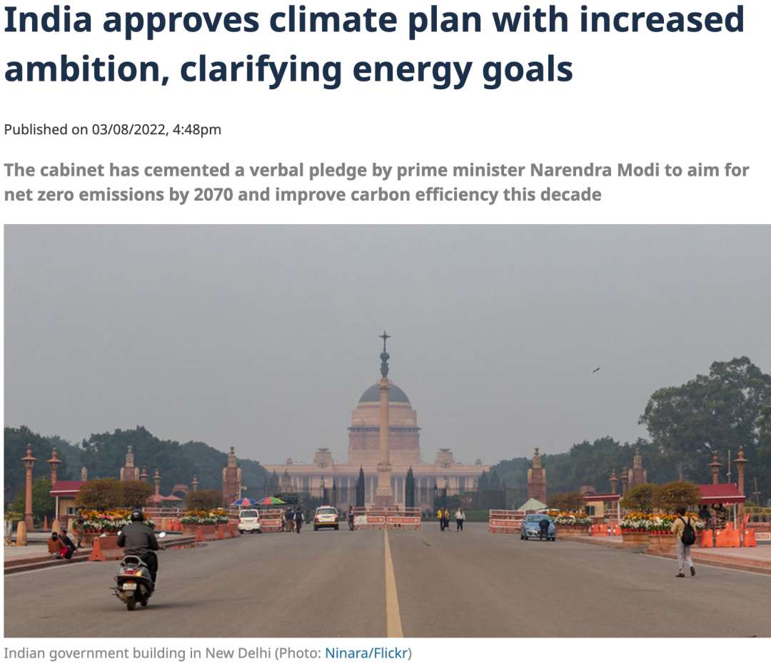 摘要:据印度媒体报道,印度政府日前正式批准更新的国家气候计划,确认了印度总理纳伦德拉·莫迪去年11月在气候变化大会上承诺的目标,即2030年实现2070年净零排放目标和45%的减排强度(相对于2005年的水平)。这一决定提高了印度在2016年设定的气候目标,当时的目标是到2030年将每单位GDP的排放量从2005年的水平减少33-35%。印度政府强调了将支持该目标的具体措施,其中包括推出LED灯泡和印度铁路脱碳计划。