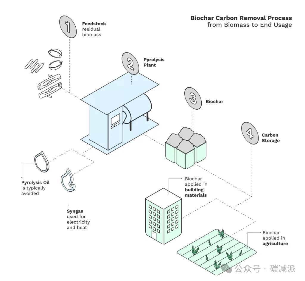 生物炭生产涉及利用农业废物等生物质,通过光合作用从大气中捕获碳。这种生物质经过热化学处理,将其转化为稳定的碳。它可以长期储存在土壤中或掺入建筑材料中,如下图所示: