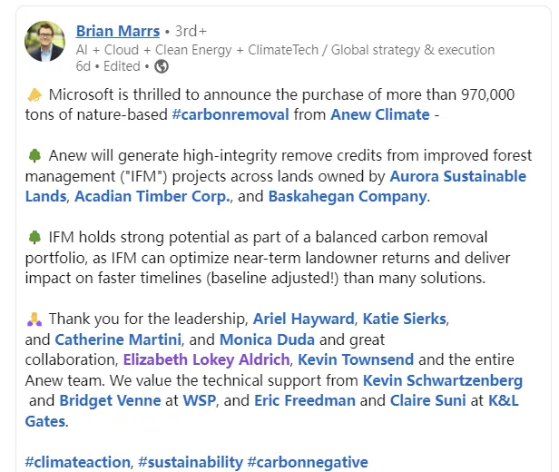微软能源与碳去除高级总监Brian Marrs也强调:“碳去除信用额度是一种经济激励,能够鼓励企业投资永续林业和土地管理实践。微软很高兴能与Anew Climate合作,帮助增加美国各地森林的碳储量。”