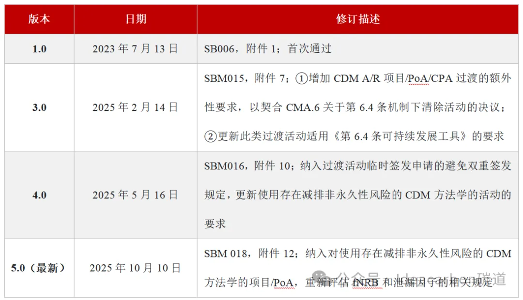 从版本演进来看,此次5.0版本是在2023年首次发布的1.0版本基础上,历经三次修订完善:2025年2月的3.0版本新增A/R项目过渡要求,5月的4.0版本强化双重签发防控,此次5.0版本则重点补充fNRB和泄漏因子的重新评估规则,反映出监督机构对过渡过程中关键风险点的持续关注。