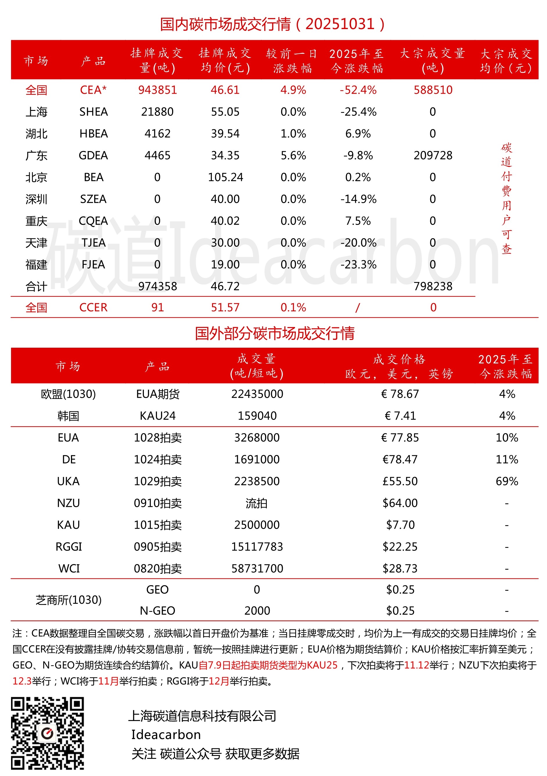 摘要:全国碳配额CEA发生588510吨大宗协议转让,成交均较市场价低13.54%