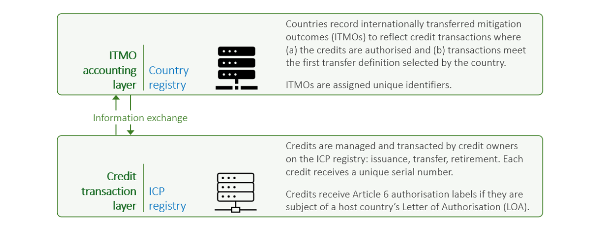 首先是规则协调。议定书明确以UNFCCC相关决议(如2/CMA.3、4/CMA.6)为基础,统一界定碳信用与国际转让减缓成果(ITMOs)的概念边界,区分两者交易层与核算层的属性——碳信用作为可交易的减排单位,由ICPs管理并标注唯一序列号;ITMOs作为会计工具,将碳信用交易转化为缔约方NDC核算影响,需关联唯一标识并经东道国授权。这种清晰界定,避免了过往因概念混淆导致的双重计算的风险,为跨境交易奠定规则基础。