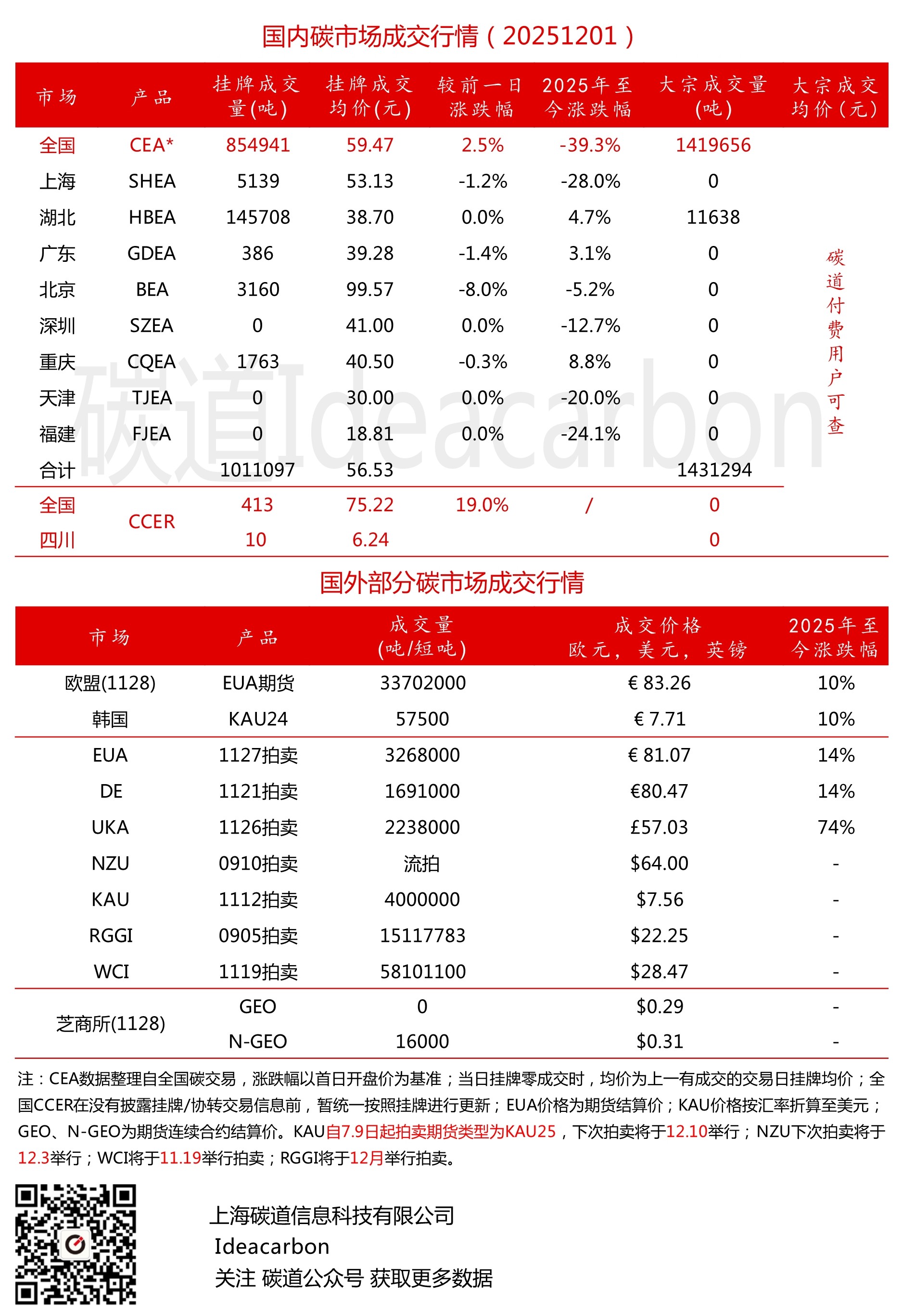 摘要:全国碳配额CEA发生1419656吨大宗协议转让,成交均较市场价低5.11%