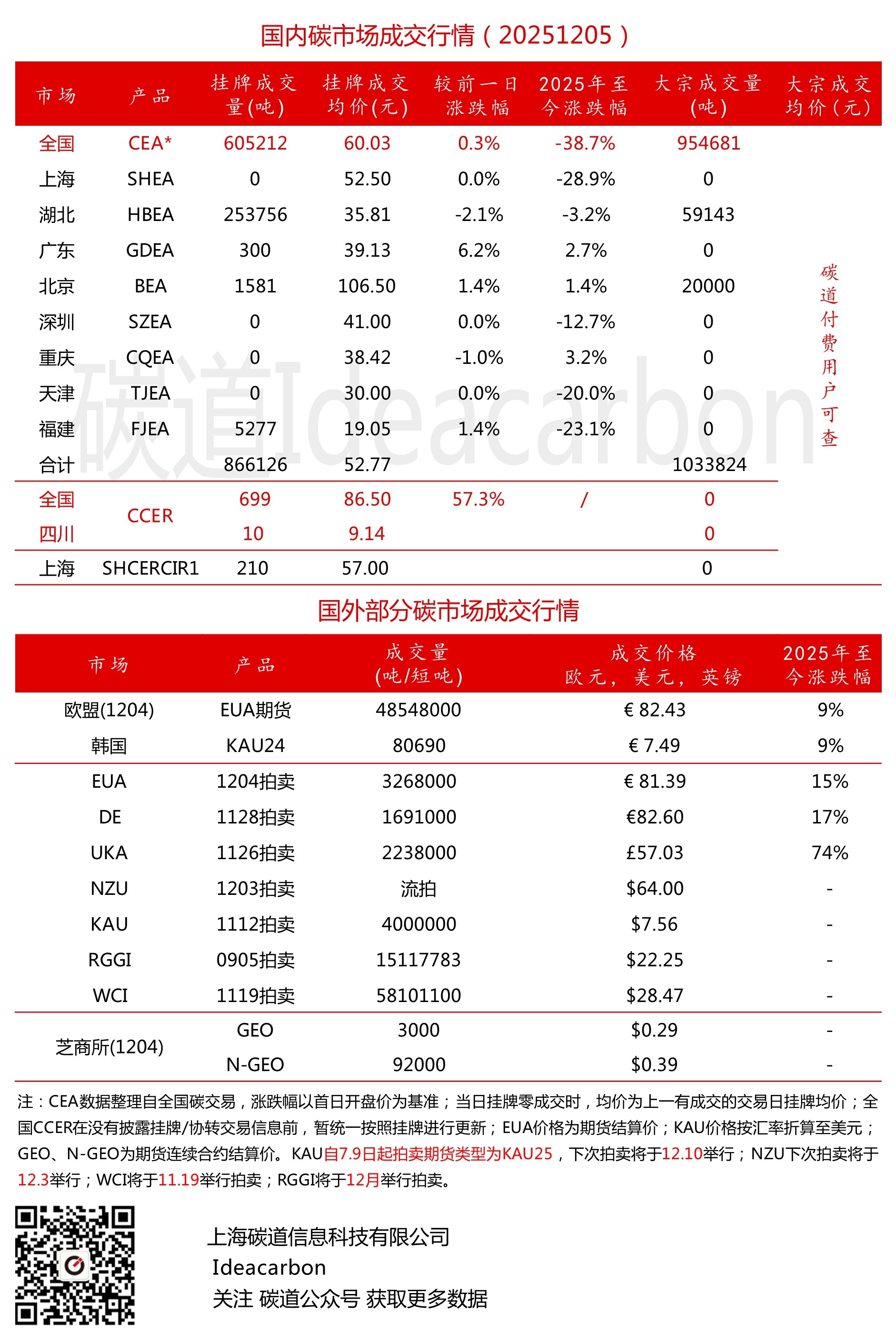 摘要:全国碳配额CEA发生954681吨大宗协议转让,成交均较市场价低2.95%