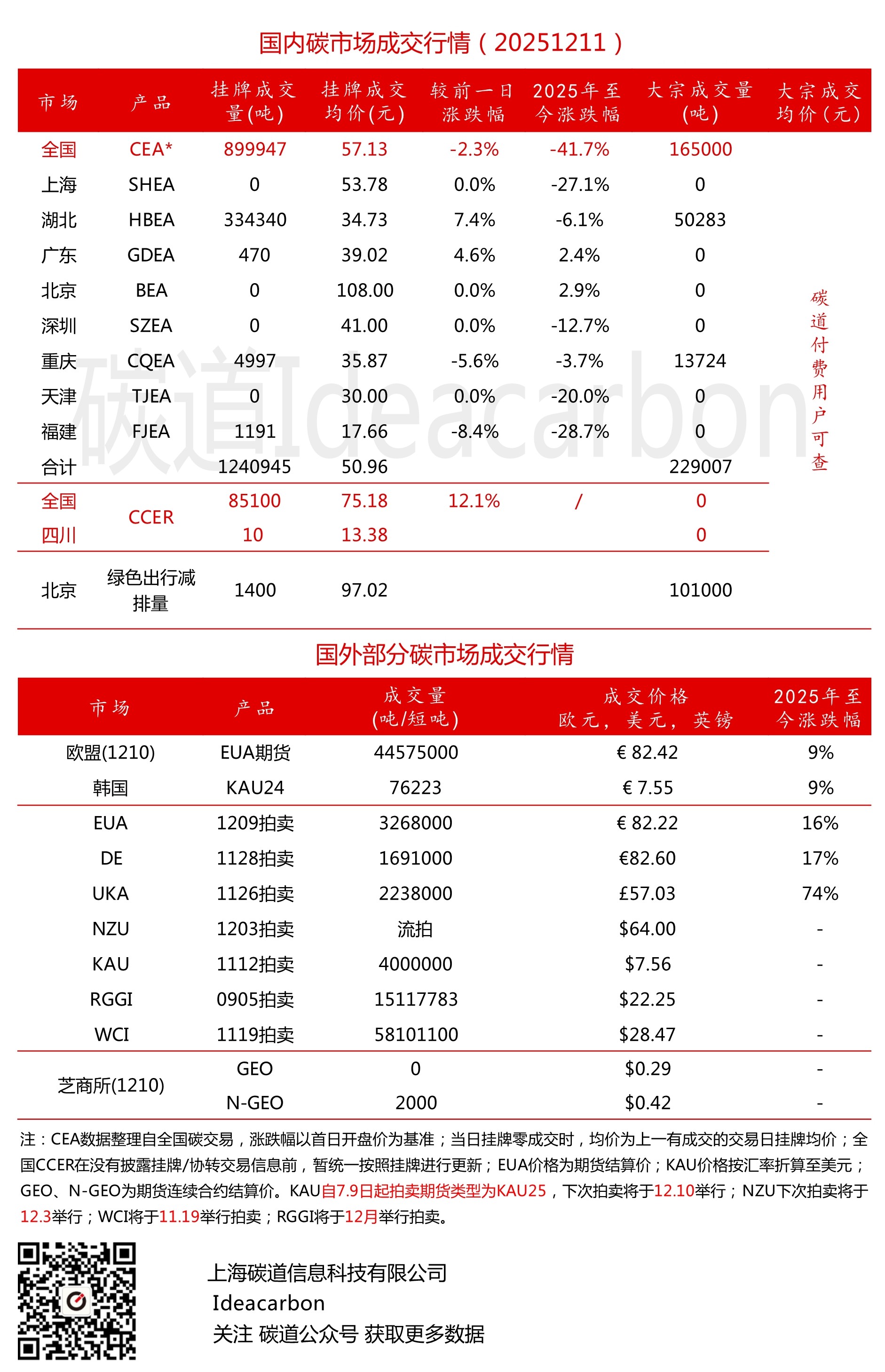 摘要:全国碳配额CEA发生16.5万吨大宗协议转让,成交均较市场价低5.48%