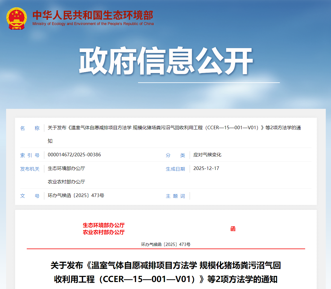 关于发布《温室气体自愿减排项目方法学 规模化猪场粪污沼气回收利用工程(CCER—15—001—V01)》等2项方法学的通知
