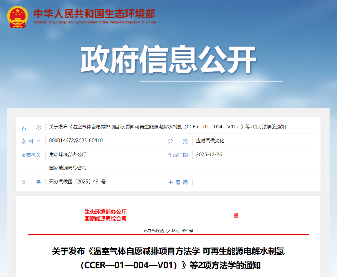 关于发布《温室气体自愿减排项目方法学 可再生能源电解水制氢(CCER—01—004—V01)》等2项方法学的通知
