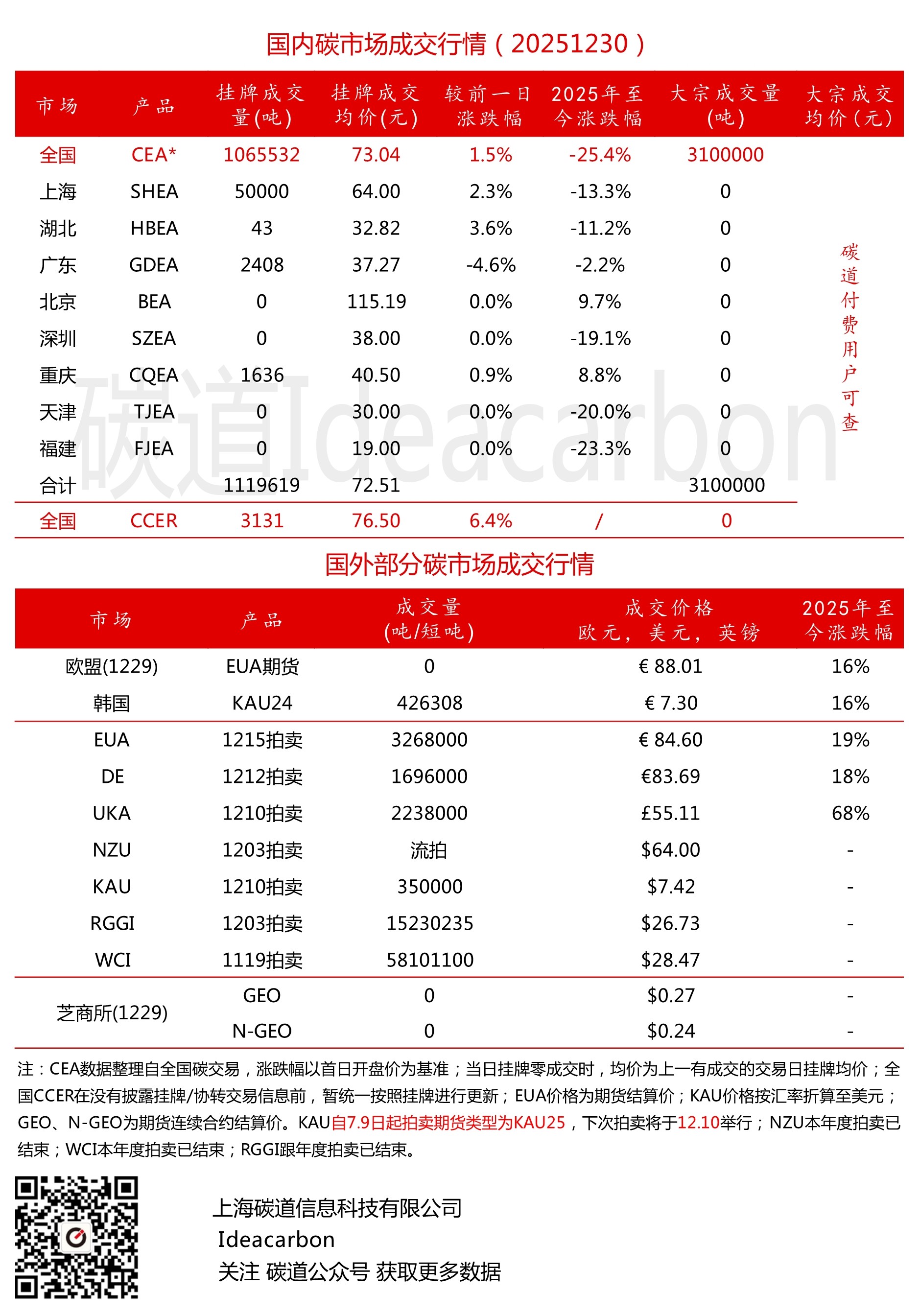 每日碳市场成交行情(20251230)