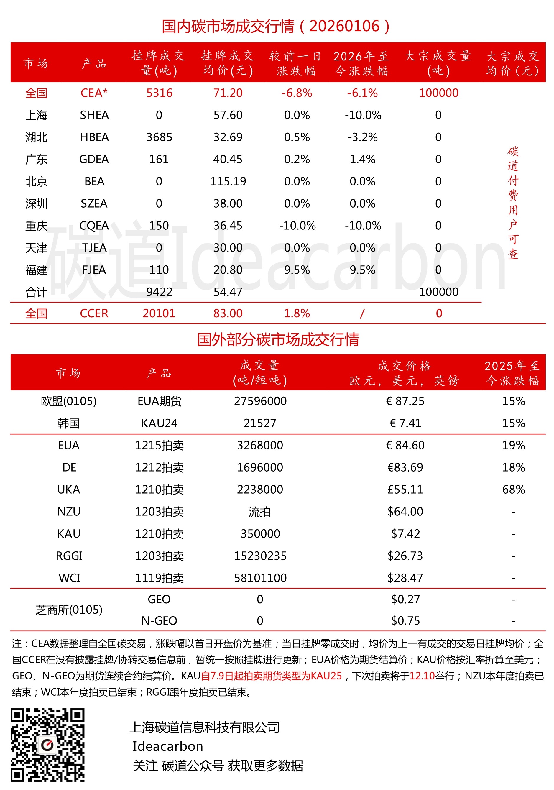 每日碳市场成交行情(20260106)