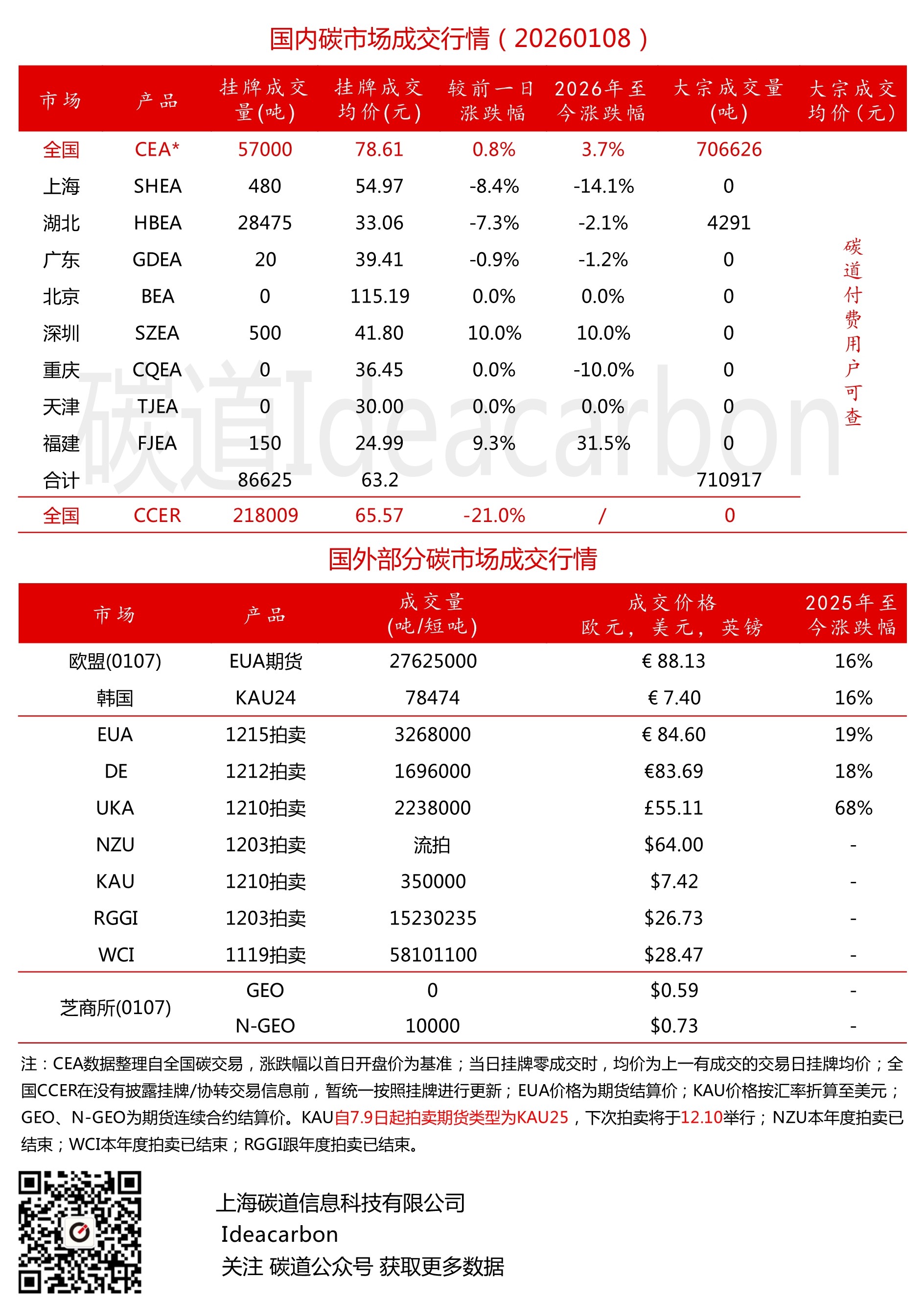 每日碳市场成交行情(20260108)