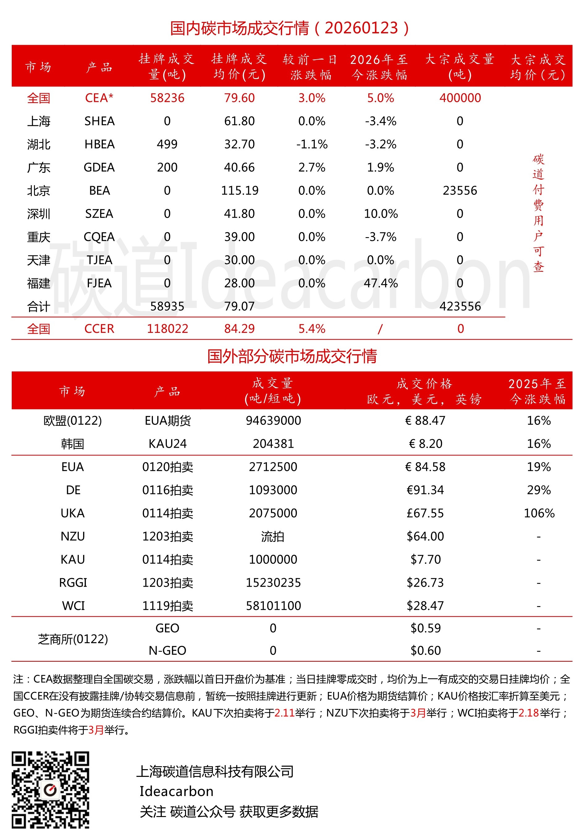 摘要:全国碳配额CEA发生40万吨大宗协议转让,成交均价较市场价高0.82%