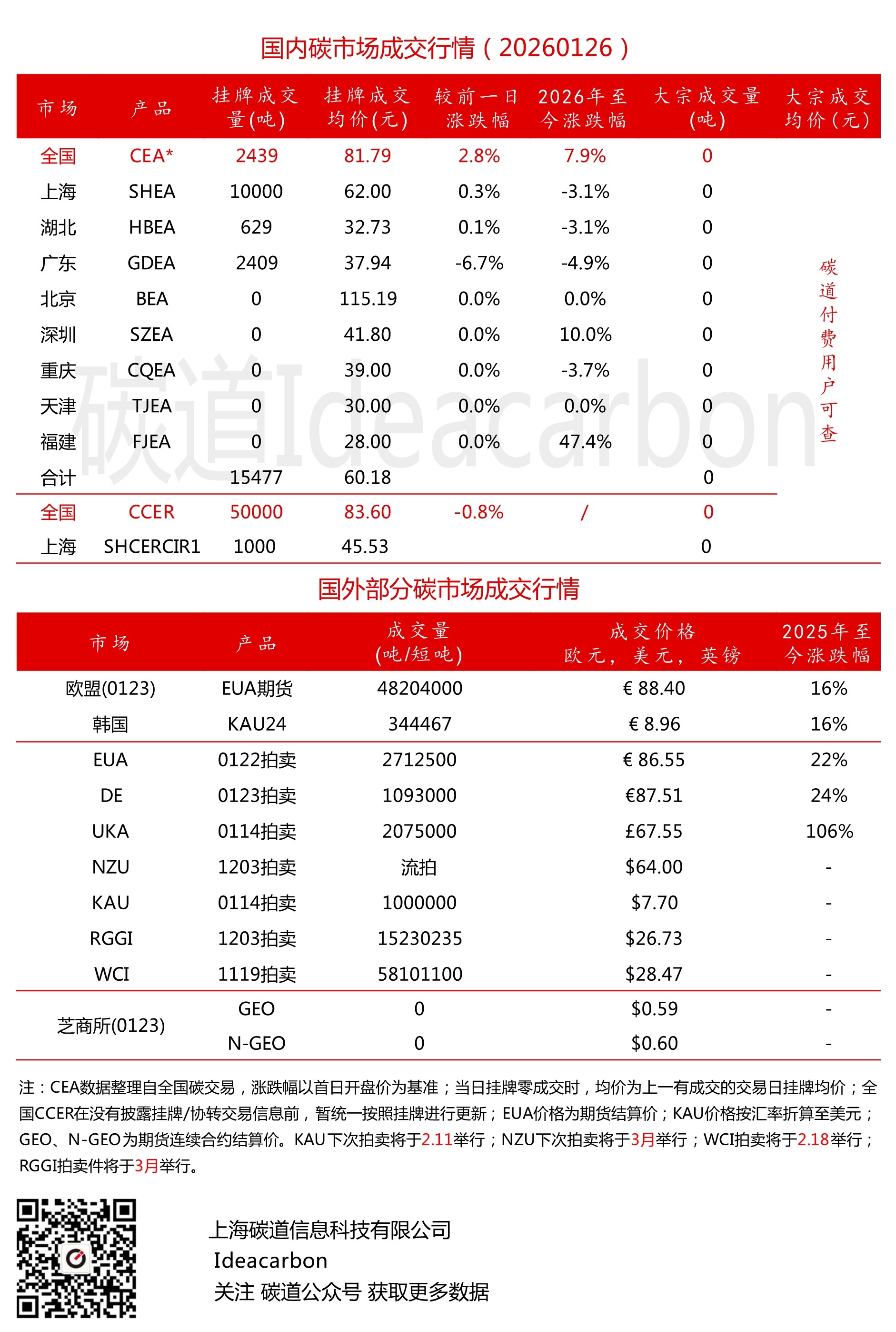 每日碳市场成交行情(20260126)