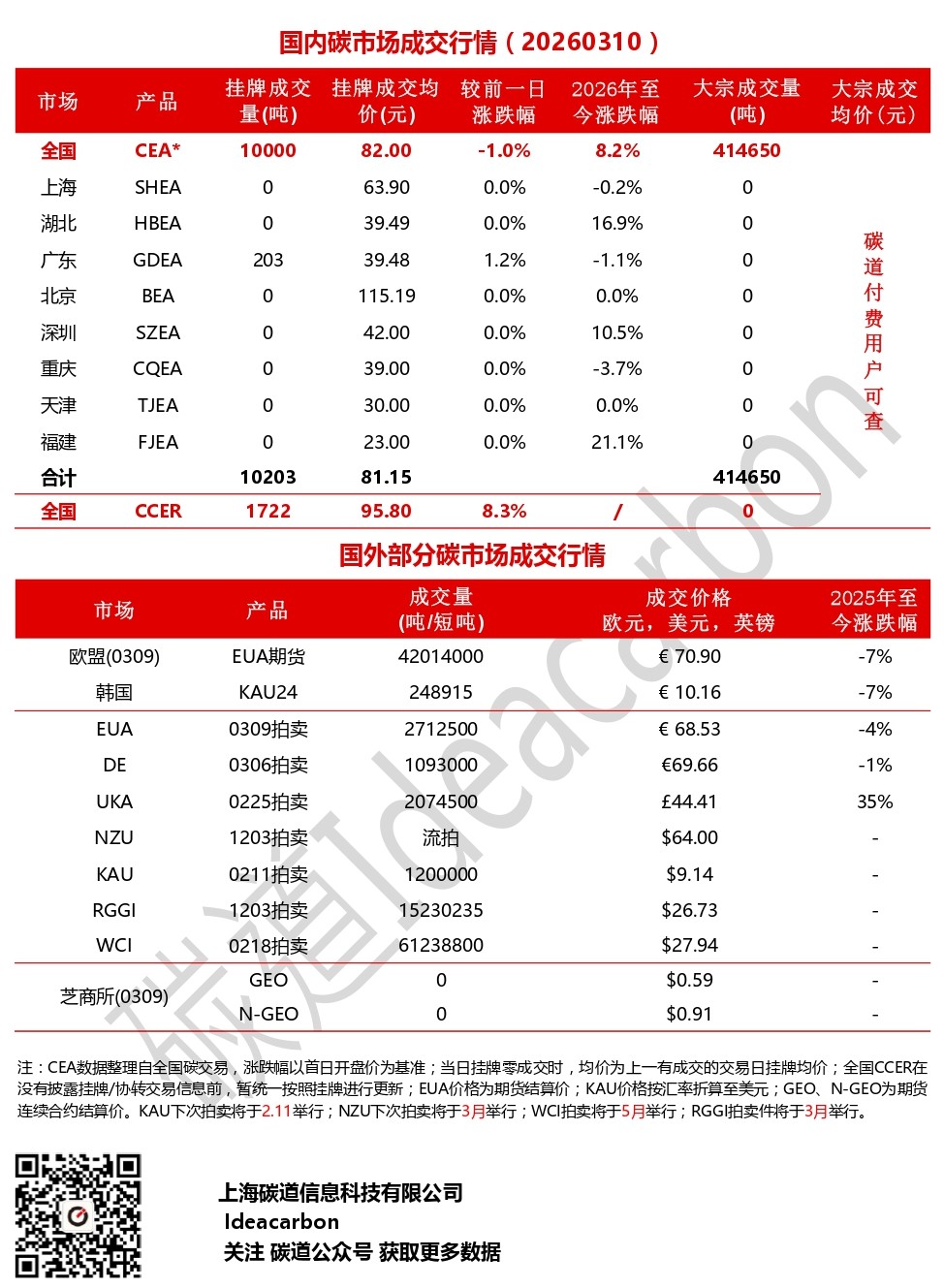 摘要:全国碳配额CEA发生414650吨大宗协议转让,成交均价较市场价低10.21%