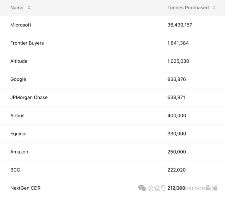 目前,包括亚马逊、谷歌、Meta等科技公司虽然仍在采购,但规模与稳定性均无法完全替代微软的市场影响力。截止2026年4月14日(下图),微软作为最大买家已承购约3644万吨的碳清除信用,显著大于其他买方,其市场主导地位不可撼动。