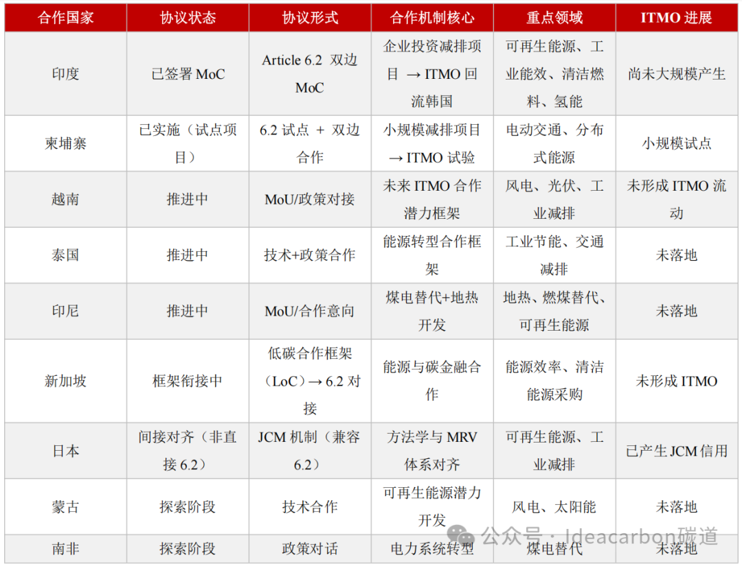 在此基础上,韩国进一步将合作网络扩展至印度等关键新兴市场,并在此次与印度正式签署第6.2条合作备忘录(MoC),标志其从试点项目阶段进入规模化机制建设阶段。同时,韩国也持续推动与越南、泰国、印尼等东南亚国家的政策与技术对接,重点围绕可再生能源、工业能效与清洁燃料替代等领域布局潜在ITMO供给项目。(如下表)