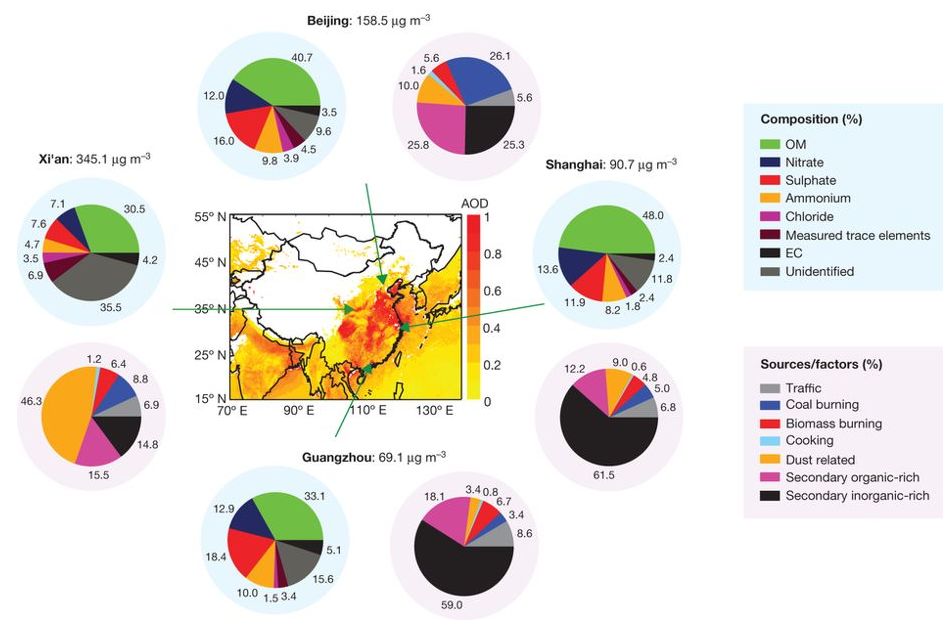 2014年,瑞士保罗谢尔研究所(PSI)和中国科学院地球环境研究所在Nature上发表文章,认为北京、上海和广州空气中高达四分之三的细颗粒物都不是来源于直接排放,而是通过二次转化,通过大气化学和物理过程完成气体到固体的转变,最后形成PM2.5的颗粒物。(Nature 514, 2014,218–222)。