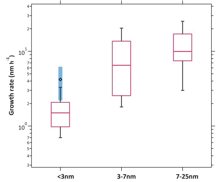 要点:3 nm以下,高硫酸浓度模拟结果与观测值稍高,说明硫酸对成核贡献明显。3 nm以上,是有机挥发物导致颗粒物进一步快速长大。