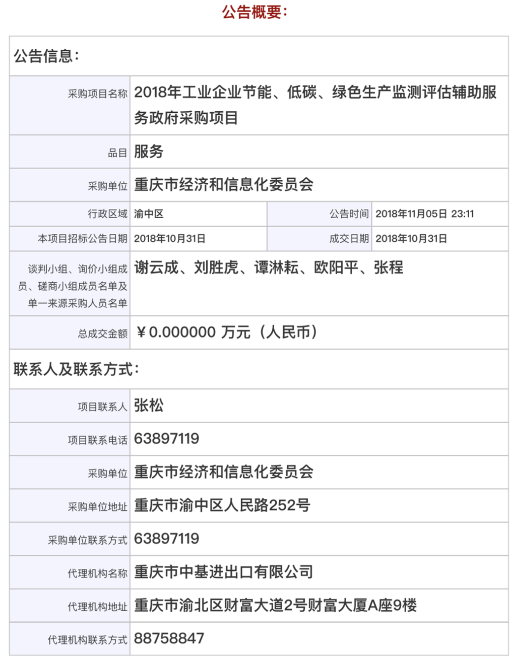 【中标】重庆市2018年工业企业节能、低碳、绿色生产监测评估辅助服务政府采购项目(18C1793)结果公告