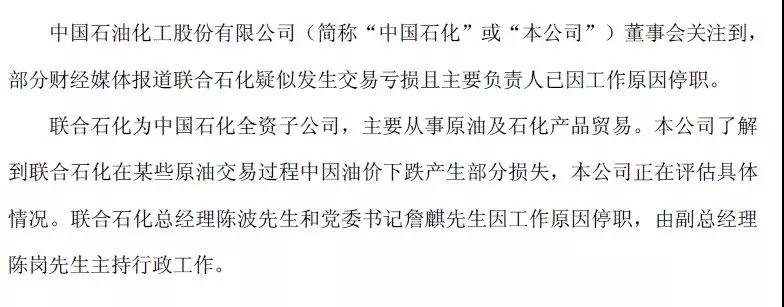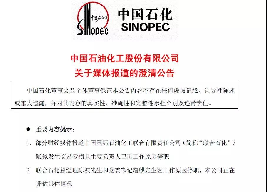 刚刚,中石化发布关于媒体报道的澄清公告,确认联合石化在某些原油交易过程中因油价下跌产生部分损失,总经理陈波先生和党委书记詹麒先生因工作原因停职,由副总经理陈岗先生主持行政工作。