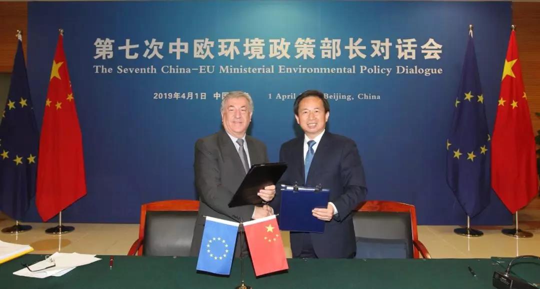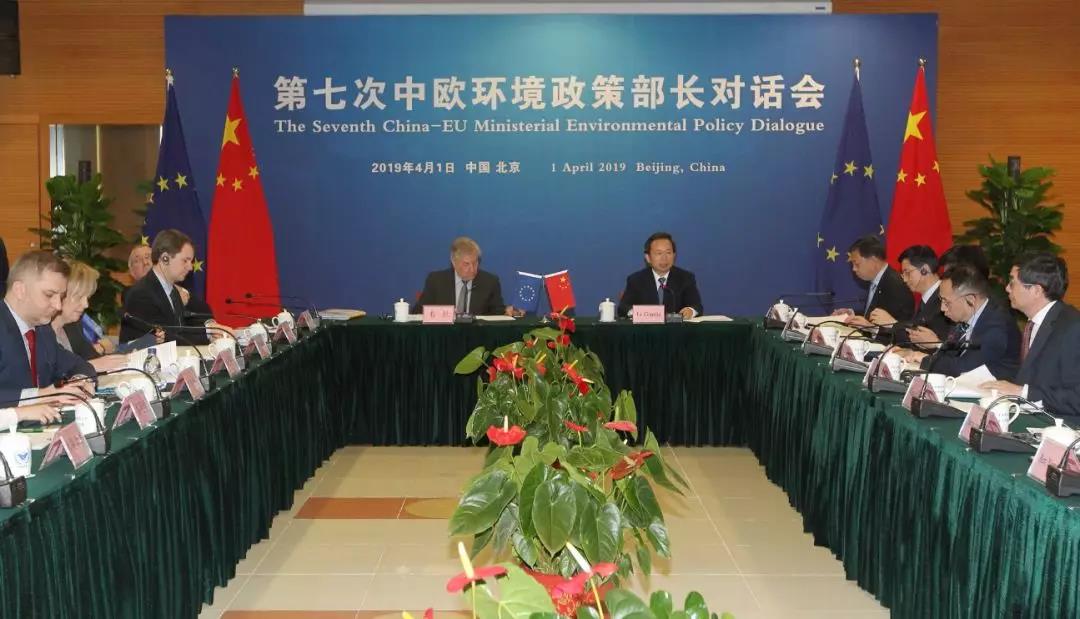 4月1日,第七次中欧环境政策部长对话会在京举行,生态环境部部长李干杰与欧盟委员会环境、海洋事务与渔业委员卡尔梅努·韦拉共同出席对话会。