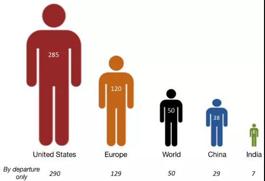为了进一步研究,我再次查阅了美国能源信息署的喷气燃料使用统计数据以估算2016年人均燃料使用情况(2016年数据是5个对比地区可获得的最近一年的数据)。世界银行《世界发展指标》的数据提供了每个国家的人口,并确定了出境游人数多于入境游客人数的国家,这主要为了区分同一架航班上的本国人和出国旅游的游客。我利用国际民航组织2016年的航空运输统计结果,将国际航空活动与国内航空活动分开,并假设某国的国内航班全部由国内居民乘坐,而不是国际游客。