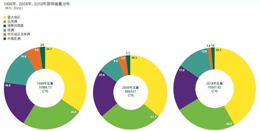 在2017年小幅回升的基础上,煤炭消费在2018年进一步上升。煤炭消费量(1.4%)和产量(4.3%)的增速均创近五年新高。产量增长集中在亚太地区(16300万吨油当量) 。其中,约一半的全球增长来自中国,印度尼西亚产量增长5100万吨油当量。煤炭消费增长为2013年以来最快增速。煤炭消费的增长同样是由亚太地区(7100万吨油当量)驱动,尤其是印度(3600万能吨油当量)。十年之前,亚太地区占全球煤炭消费的三分之二,如今这一比重已经上升至四分之三。