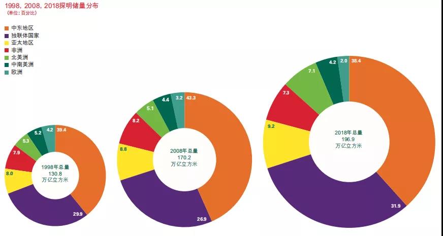 2018全球天然气探明储量增加0.7万亿立方米,达196.9万亿立方米。增长的原因主要是阿塞拜疆新增的储量(0.8万立方米)。俄罗斯(38.9万亿立方米)、伊朗(31.9万亿立方米)和卡塔尔(24.7万亿立方米)是储量最高的三个国家。根据2018年的储产比,全球天然气还可以以现有的生产水平生产50.9年,相较2017年减少2.4年。中东(109.9年)和独联体国家(75.6年)的储产比高于其他地区。