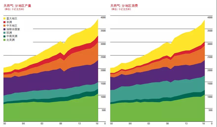 2018年是天然气取得繁荣发展的一年。全球消费和产量都实现了5%以上的增长,均是近三十年的最快增速之一。美国贡献了全球40%的需求增长和45%的产量增长,是这一势头的最主要推力。