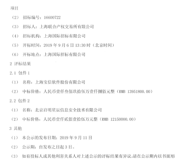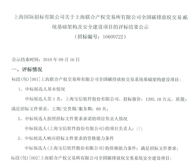 上海宝信、北京启明星辰中标上海联合产权交易所有限公司全国碳排放权交易系统基础架构及安全建设项目(1395.18万、1215万)