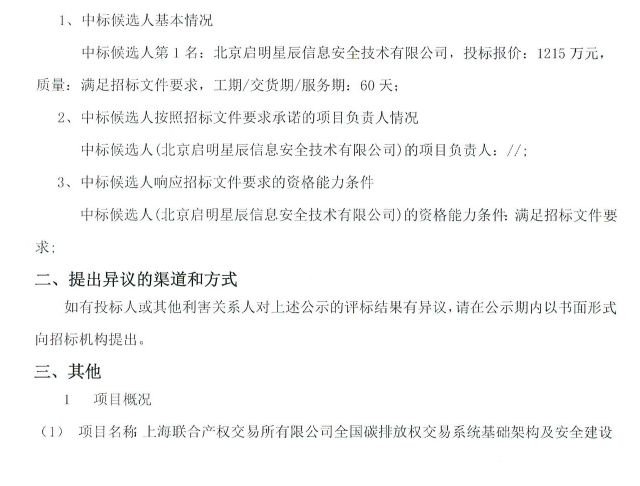 摘要:上海国际招标有限公司关于上海联合产权交易所有限公司全国碳排放权交易系统基础架构及安全建设项目的评标结果公示