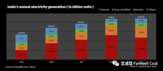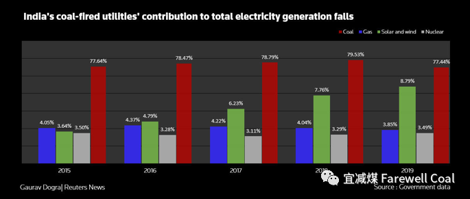 据路透社2020年2月17日题为India's annual coal power output falls for first time in a decade的报道称,印度2019年煤电发电量下降,为过去十年来的第一次。主要原因是经济增速放缓以及可再生能源比例提升。