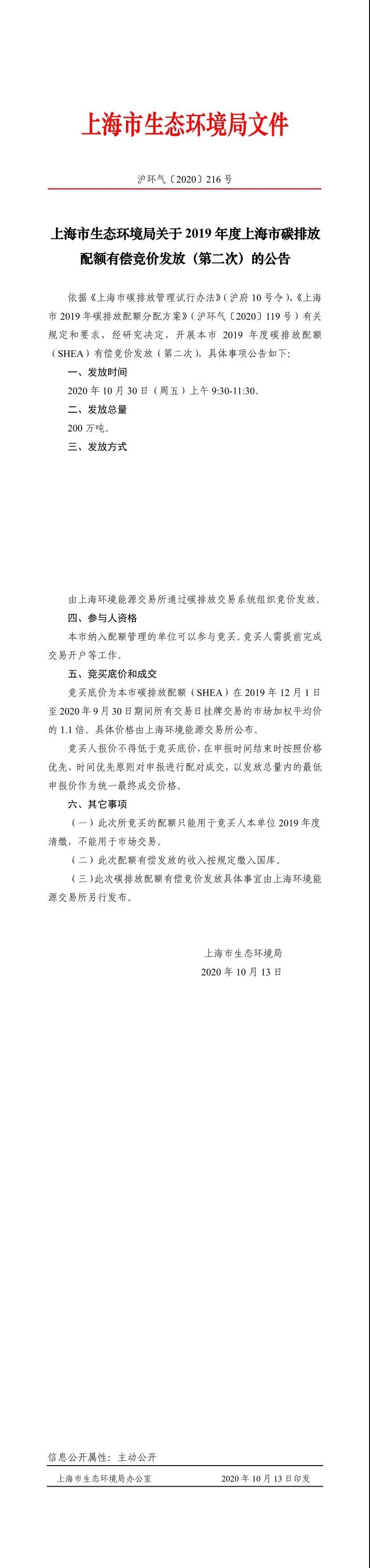 摘要:上海市生态环境局关于2019年度上海市碳排放配额有偿竞价发放(第二次)的公告