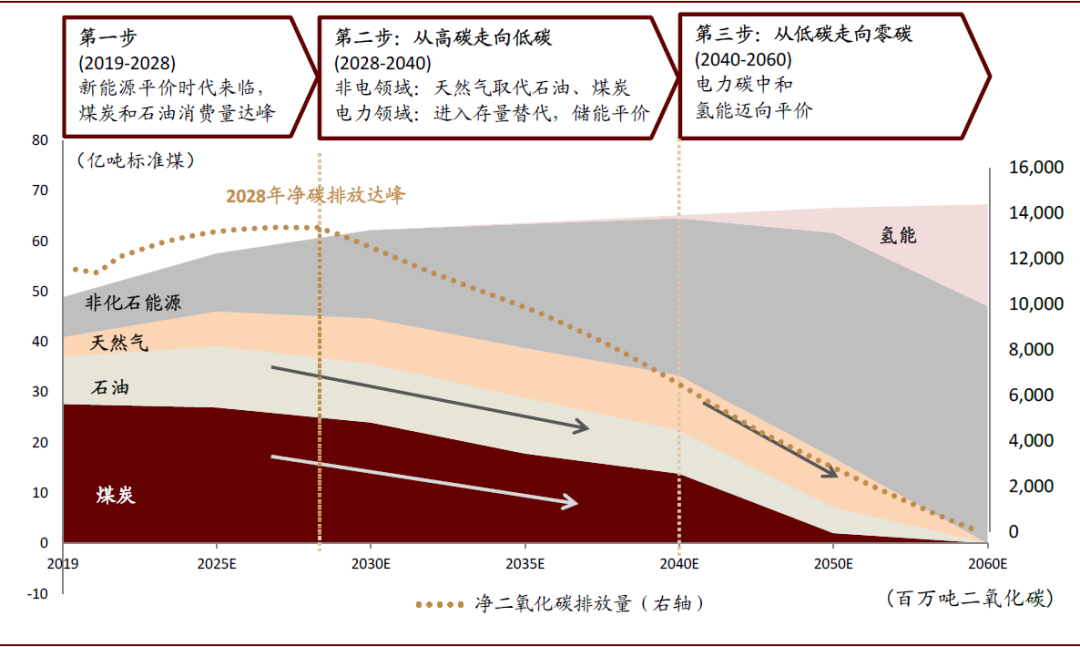 ►我们认为未来中国的能源发展将会经历从高碳到低碳到零碳的过程,分别是现在至2028年新能源平价时代来临,煤炭、石油消费量达峰,碳排放在2028年达峰;2028-2040年非电领域通过天然气代替石油煤炭降低碳排放,在电力领域新能源从增量替代逐渐开始存量替代,分别完成用户端储能+新能源和发电端储能+新能源平价,中国碳排放从高碳走向低碳;2040-2060年随着发电成本进一步降低、氢能迈向平价,完成能源碳中和。