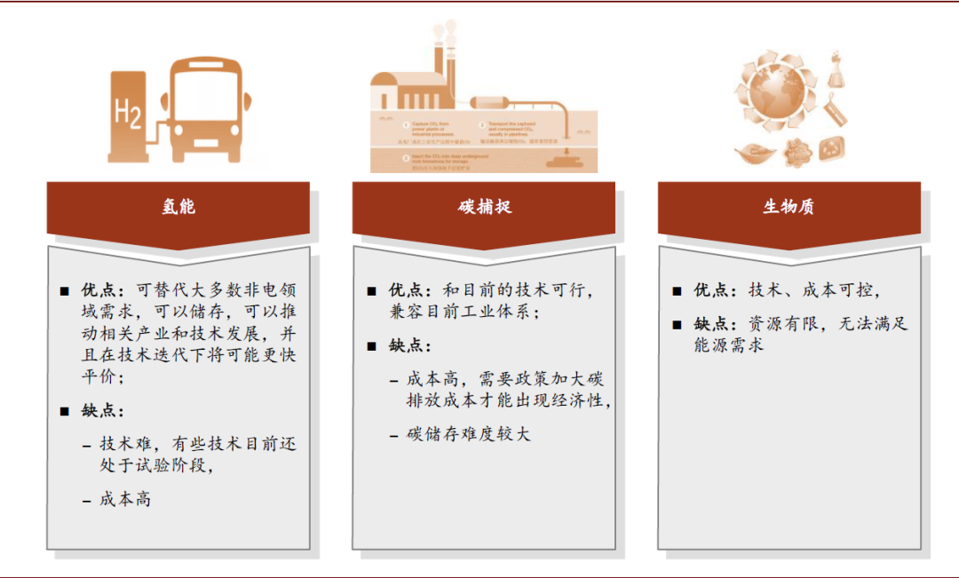 ►氢能可能是最终解决方案。我们认为要实现能源最终的能源碳中和必须在非电领域推动新的技术发展和应用,目前来看主要有三个解决方案,分别是氢能源,碳捕捉和生物质。但是考虑到生物质资源上的限制,以及碳捕捉对于政策要求,氢能在产业发展,技术迭代上优势更强,因此更有可能是最终解决方案。
