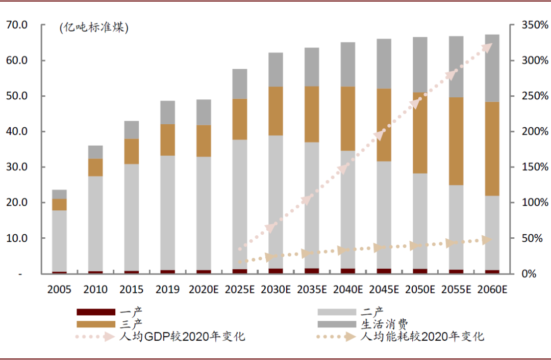 ► 预计能源消费总量或在2060年达到67.3亿吨标准煤(总量较当前上行38%),增速逐步放缓。我们预测我国的能源消费总量将在2025/2035/2060年分别达到57.6/63.6/67.3亿吨标准煤,总体保持连年同比增长。但随着单位GDP能耗较低的三产比重不断扩大,能源消费增速将呈现放缓走势。