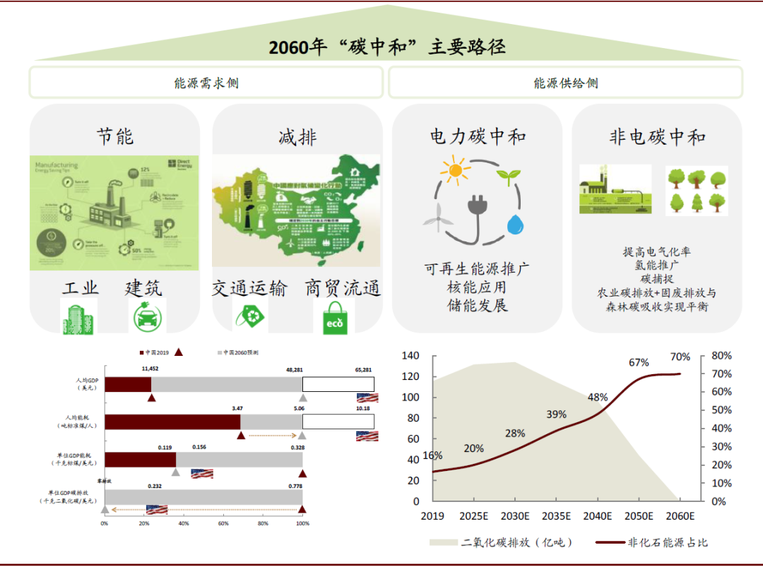 我们认为中国要达成2060年“碳中和”的目标,需要从能源需求侧和供给侧两方面进行: