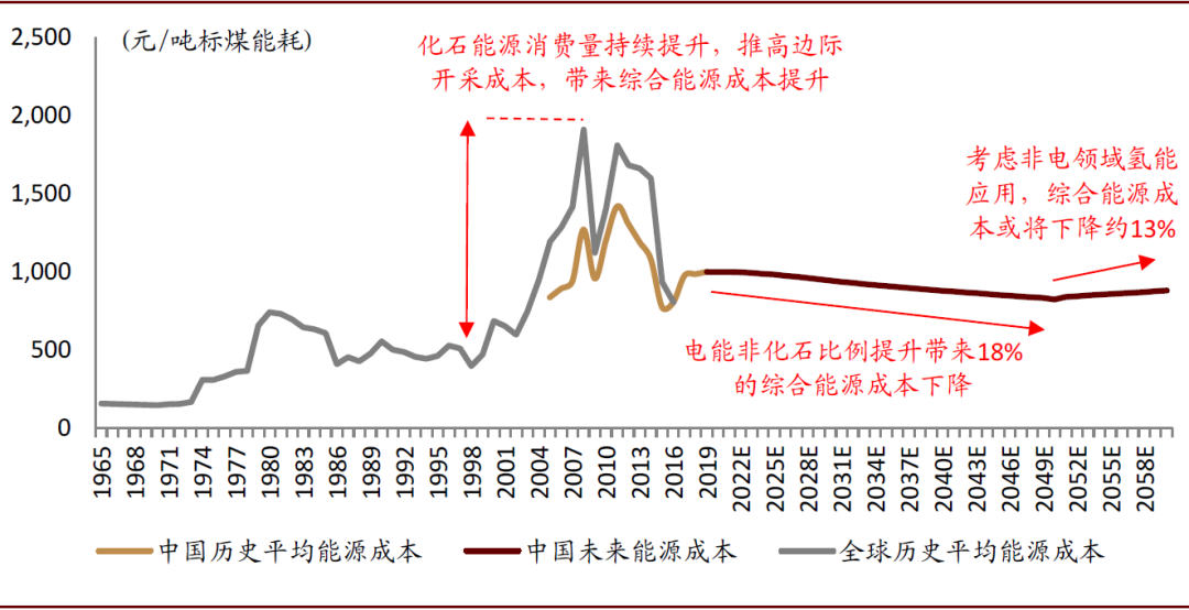 ►我们认为随着国内能源需求总量未来持续增长,人均能源需求向发达经济体进一步看齐的过程中,能否实现单位能源成本的维持或下降,将是能源结构可持续发展的重中之重。我们认为资源属性仍将导致传统能源(煤、石油、天然气)的边际开采成本稳中有升,而制造业属性将继续驱动新能源发电技术的持续降本,随着新能源占比的稳步提升,我们认为我国的综合能源成本将在未来40年下降13%,主要受益于两个维度:(1)2035年后,光储、光储氢平价后新能源装机加速,能源成本加速下降;(2)化石能源减量退出,压低边际成本,也促进了综合成本下降。也意味着中国将以更小的经济代价、完成能源结构转型。